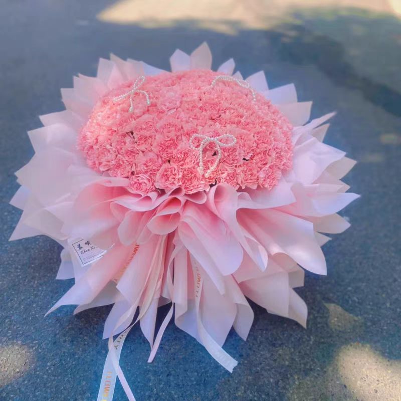 浪漫温馨祝福---99支粉色康乃馨珍珠装饰粉色欧雅纸多层圆形包装熊抱花束