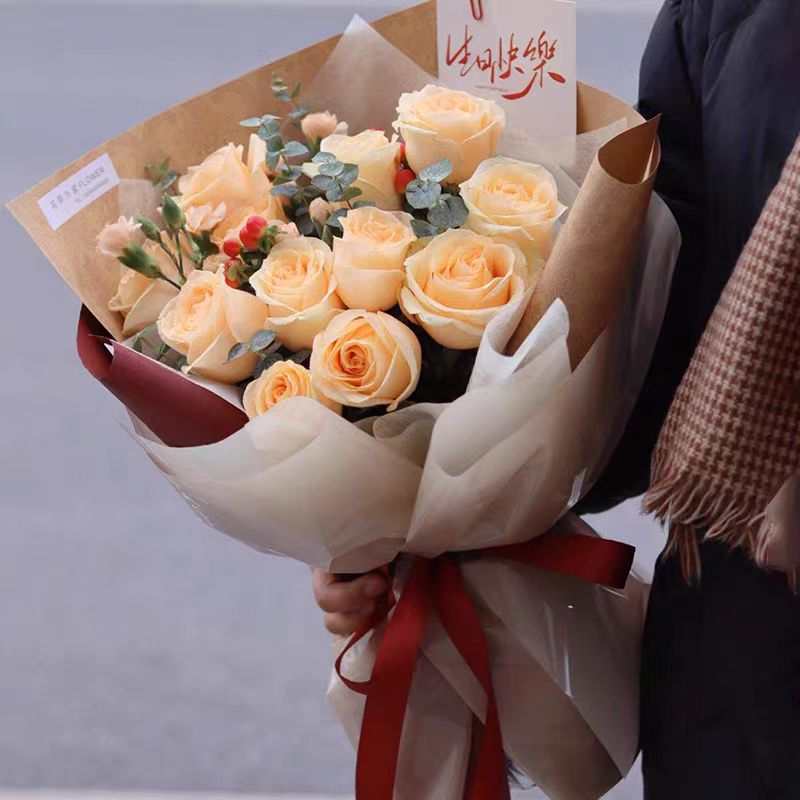 暖暖花开--11支香槟玫瑰搭配尤加利2支多头粉康