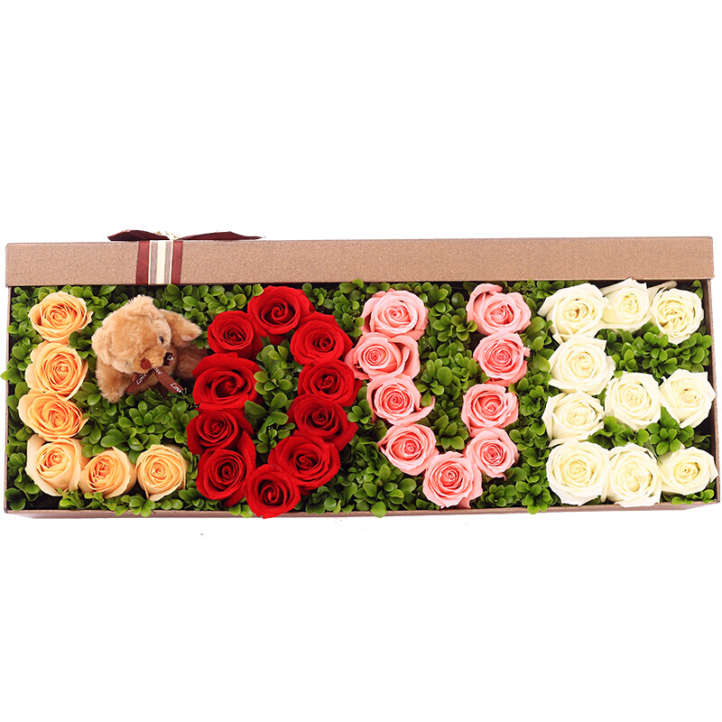 钟爱一生-9朵戴安娜玫瑰、10朵红玫瑰、6朵香槟玫瑰、10朵白玫瑰摆成LOVE、一个小熊、黄杨叶铺垫