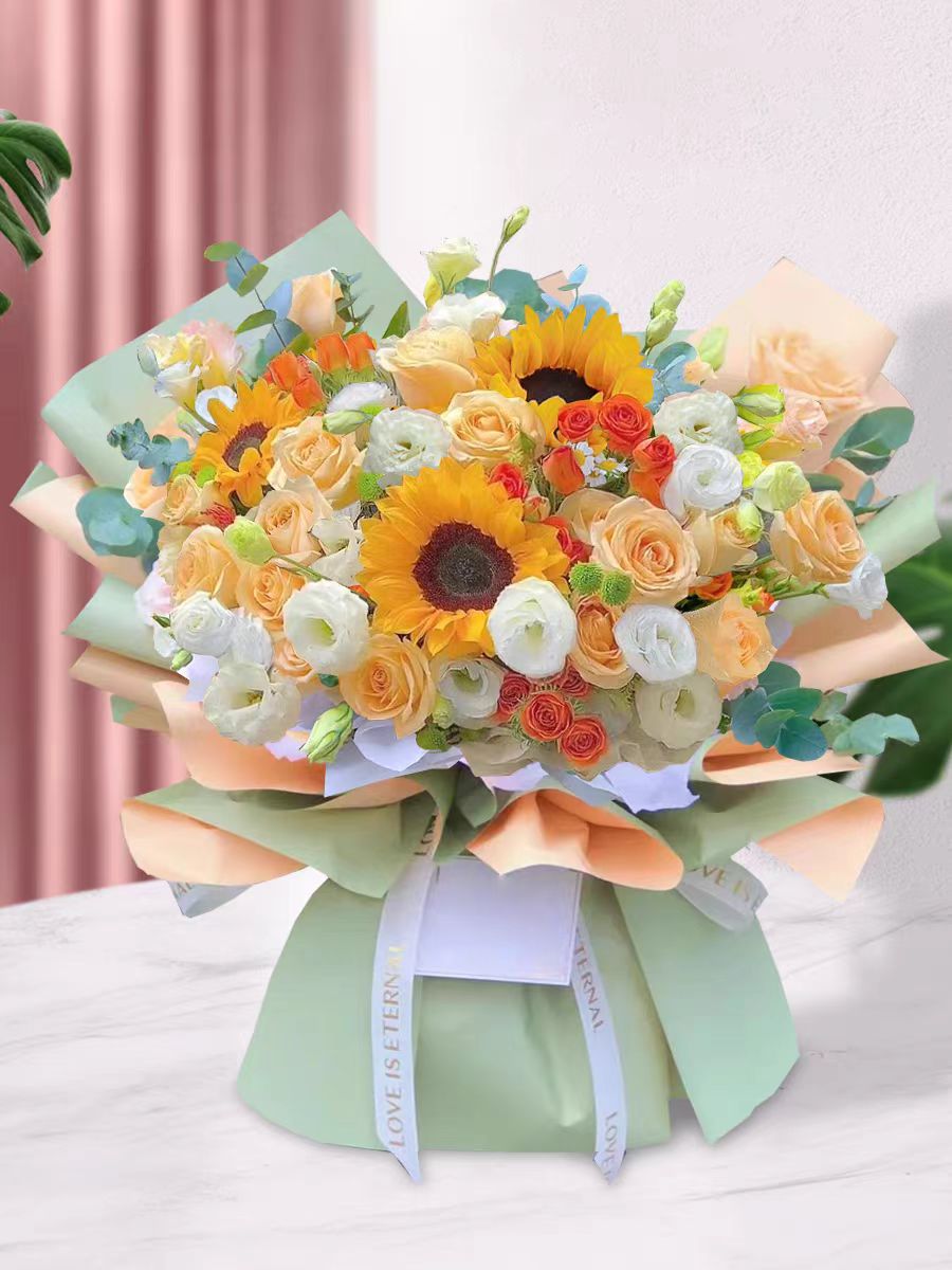 父亲节热销款---3支向日葵19支香槟玫瑰10支多头洋桔梗4支橙色泡泡玫瑰尤加利搭配