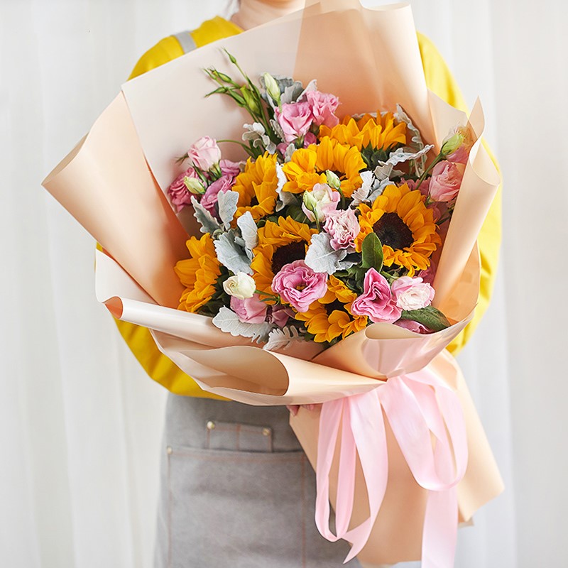 给你的祝福-7支向日葵,粉桔梗丰满间插,搭配银叶菊和栀子叶