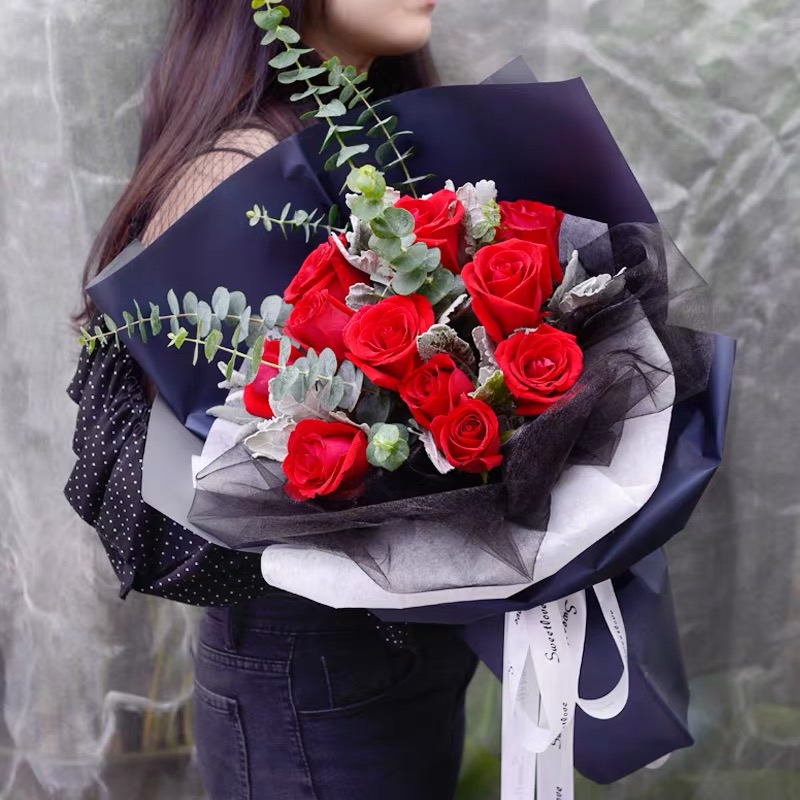 璨若星河-11支红玫瑰,搭配适量尤加利、栀子叶丰满装饰,点缀银叶菊。白色硬纱黑色扇形包装