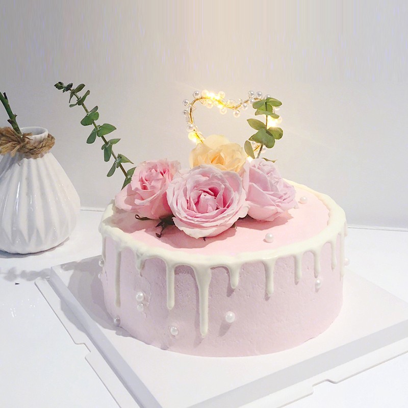 浓情丝语- 水果夹心奶油蛋糕,粉玫瑰3朵,香槟玫瑰1朵装饰,尤加利叶,心形发光插件装饰