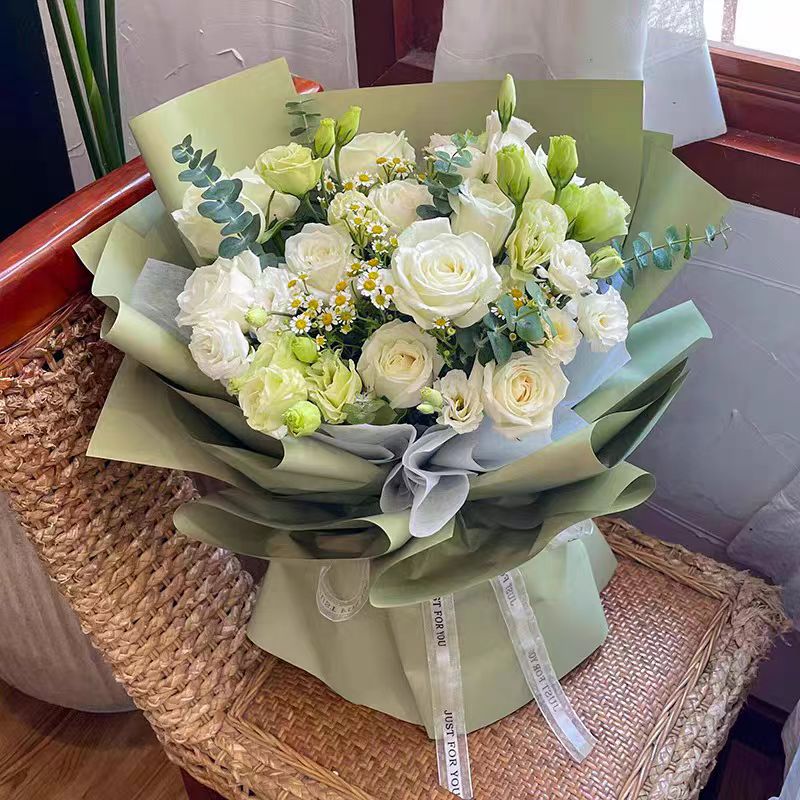 浪漫之约---11支白玫瑰6支洋桔梗2支洋甘菊适量满天星