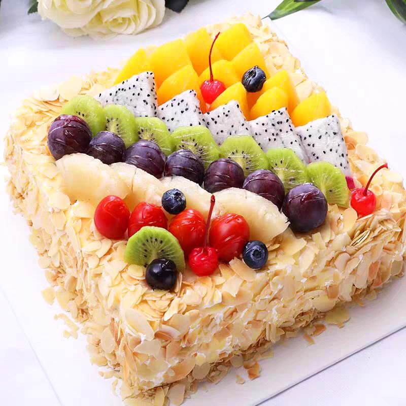 动物奶油方形鲜果蛋糕---杏仁片或花生碎新鲜水果装饰