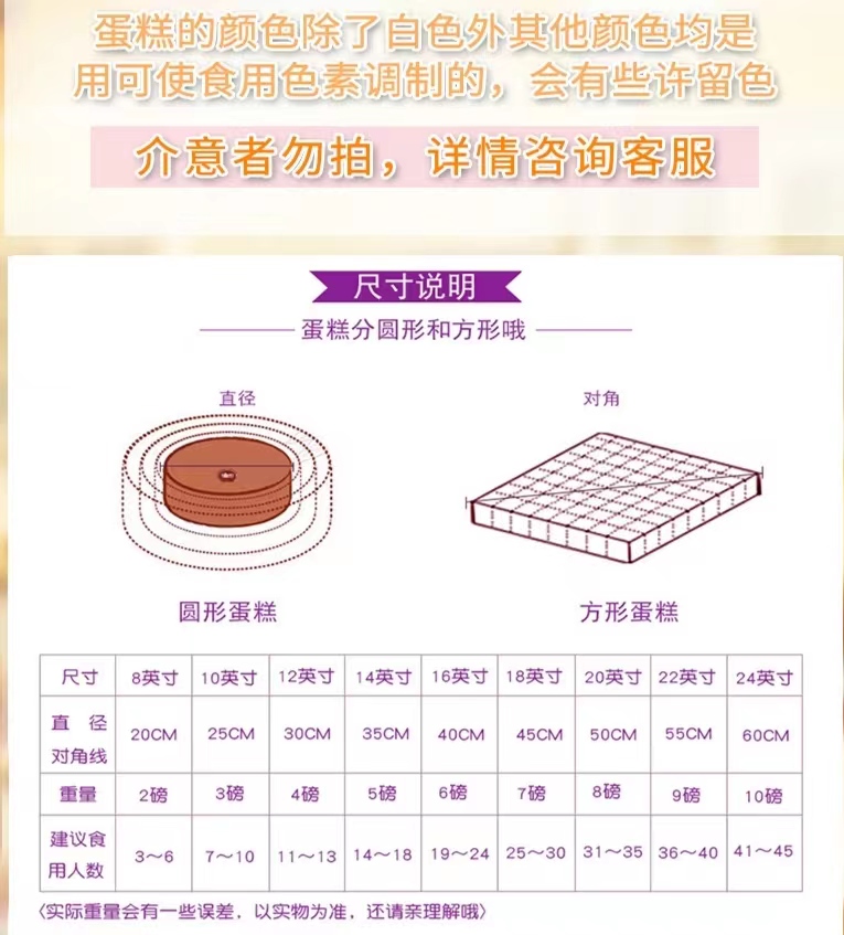 蛋糕乃手工制作产品,不同的糕点师对图片上花型的理解不同以及制作手工不同,另外受当地原料因素等原因影响,当某些材料和颜色缺乏时,我们会以相近的替代,收货人实际收到的产品可能与网页上看到的图片存在一些差异