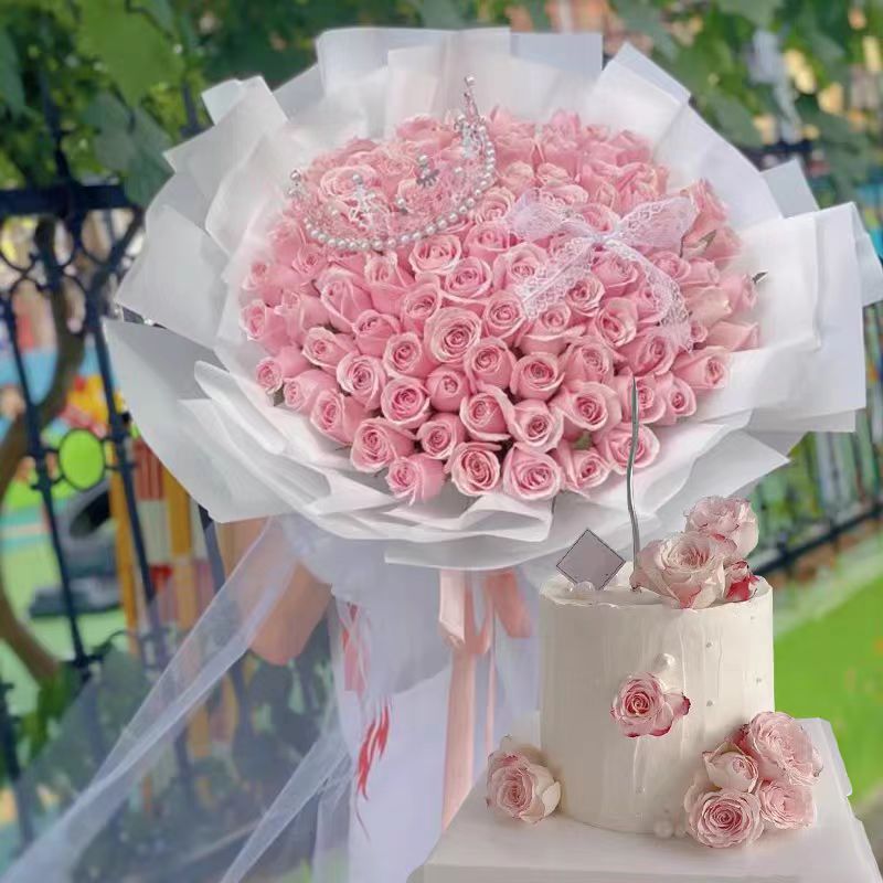 满眼是你 99支粉雪山+8寸加高款同色玫瑰款鲜奶蛋糕