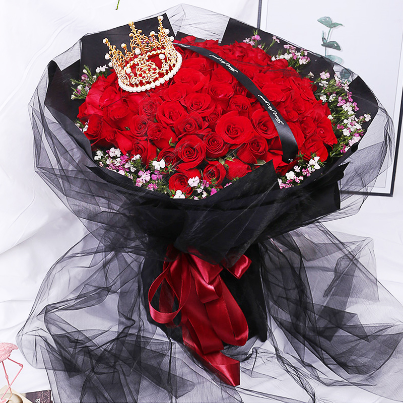 心底花园-99朵精品红玫瑰,粉色相思梅丰满围边,搭配皇冠、黑色英文缎带装饰