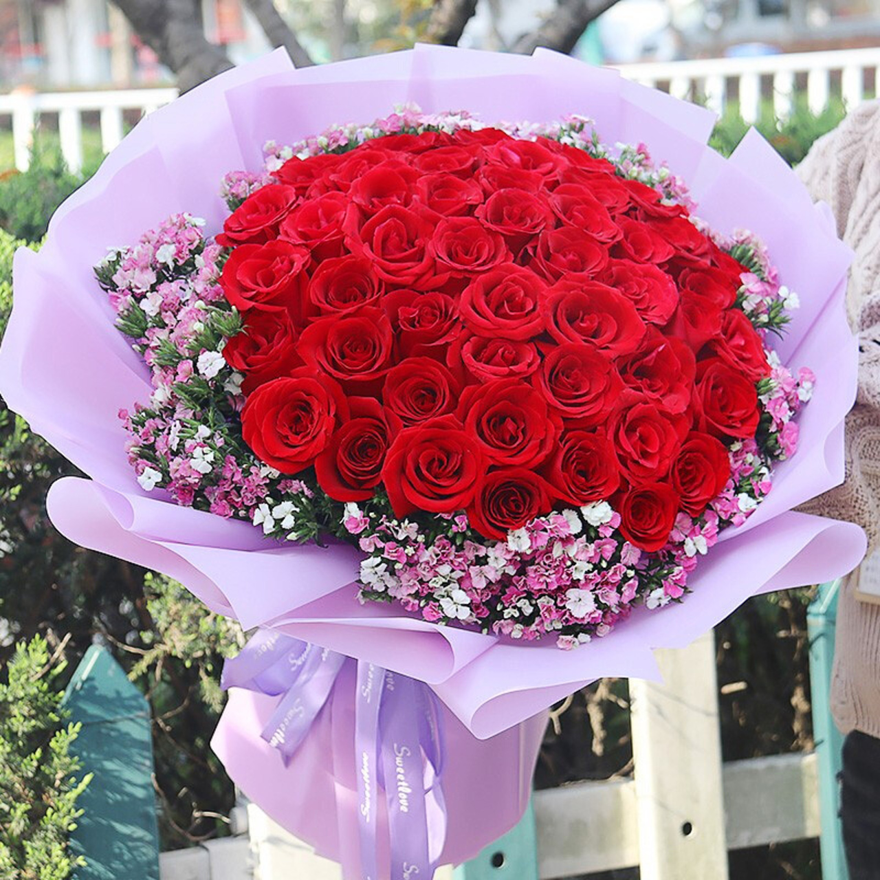 忘情巴黎-66朵红玫瑰,足量粉色石竹梅(或者粉色满天星)丰满围边。