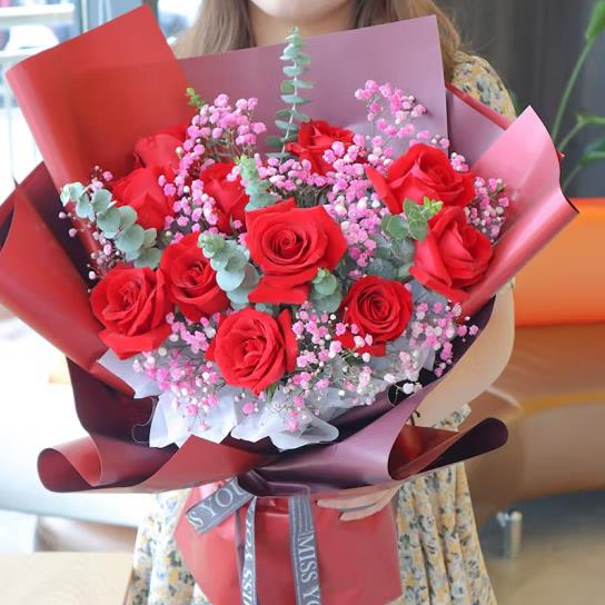爱你一生不变-11支红玫瑰,搭配足量满天星尤加利,白色内衬,红色欧雅纸外包