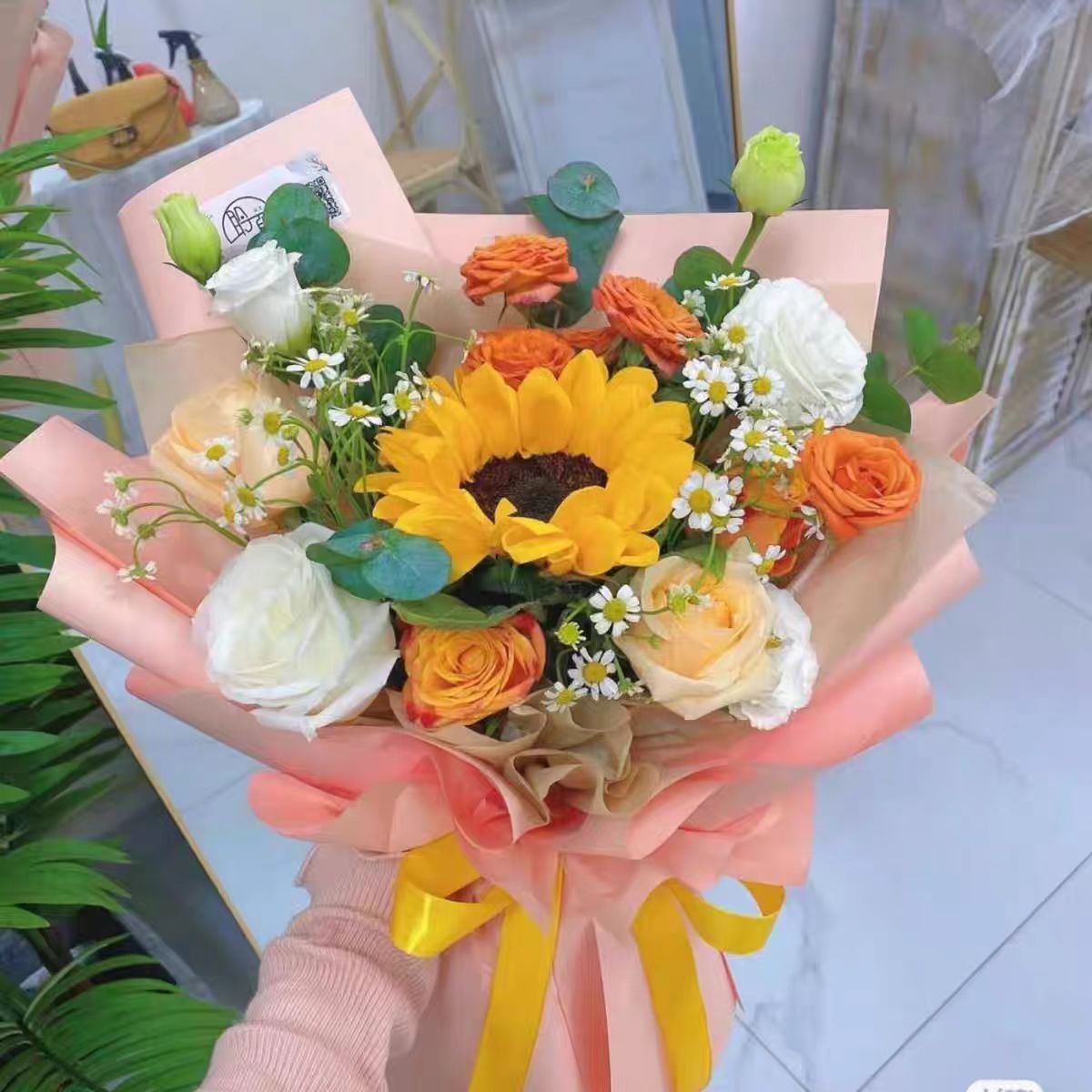 一举夺魁-1朵向日葵,2朵香槟玫瑰,两枝多头玫瑰,2支多头白色洋桔梗搭配尤加利叶等间插搭配