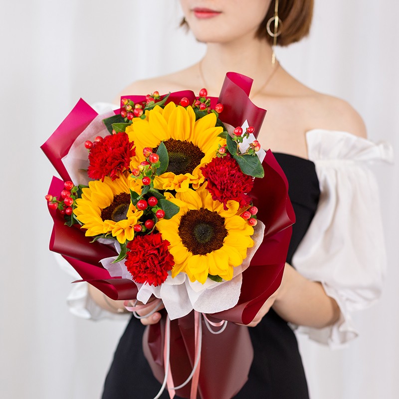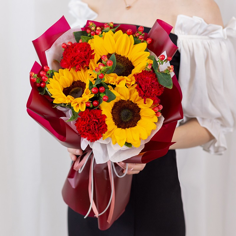 圆满时光-3朵向日葵,3朵红色康乃馨,红豆间插搭配