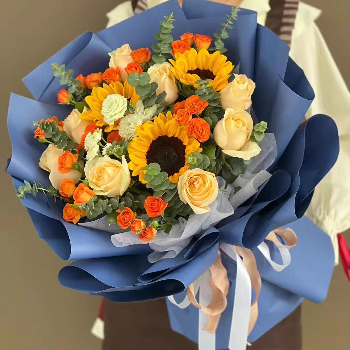 师恩难忘-3枝向日葵、8枝香槟玫瑰、6枝橙色泡泡多头玫瑰搭配3支绿桔梗(或者白桔梗)、尤加利叶