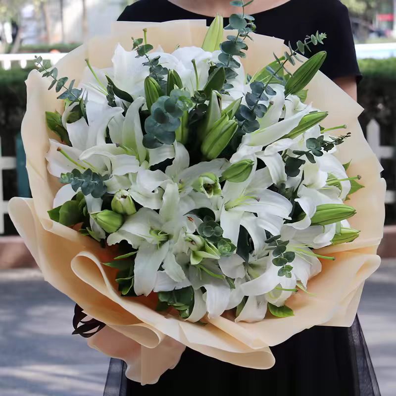 暖心祝福-11枝多头白百合,搭配尤加利