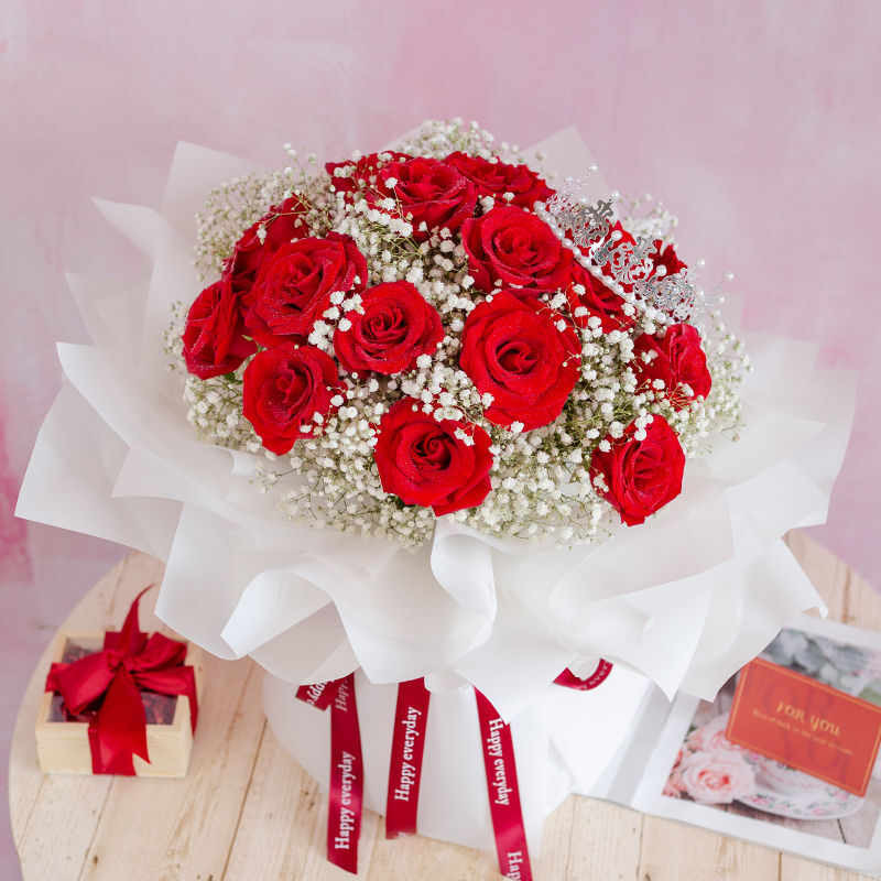 爱的纪念日——19朵红玫瑰,足量白色满天星丰满,皇冠装饰,多层高档白色包装纸折角圆形花束