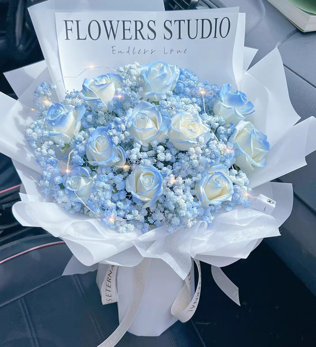 深情款款-11朵碎冰蓝(鲜花),白色满天星丰满