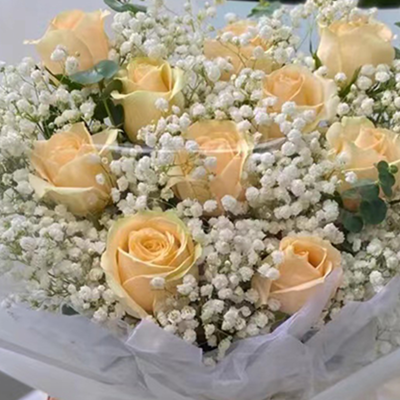 爱的甜蜜-11枝香槟玫瑰,满天星丰满,尤加利叶间插搭配