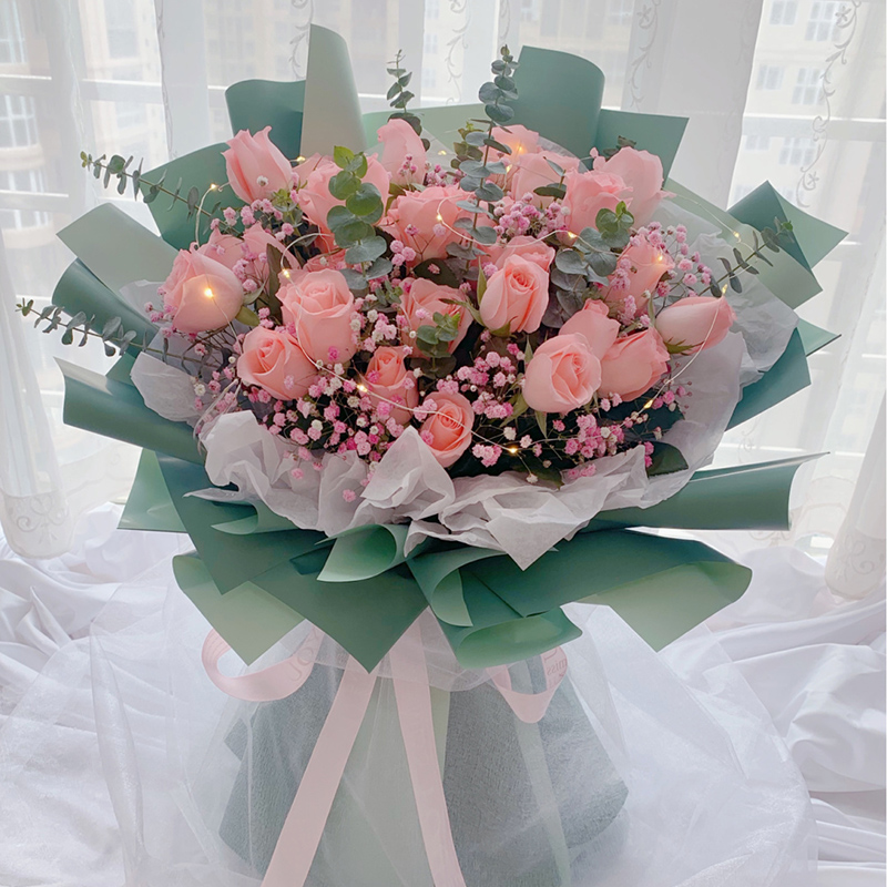 我的小公主--33朵精品粉色戴安娜玫瑰,搭配满天星、尤加利叶装饰。赠送彩灯一根.