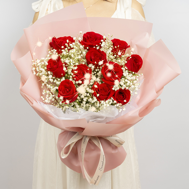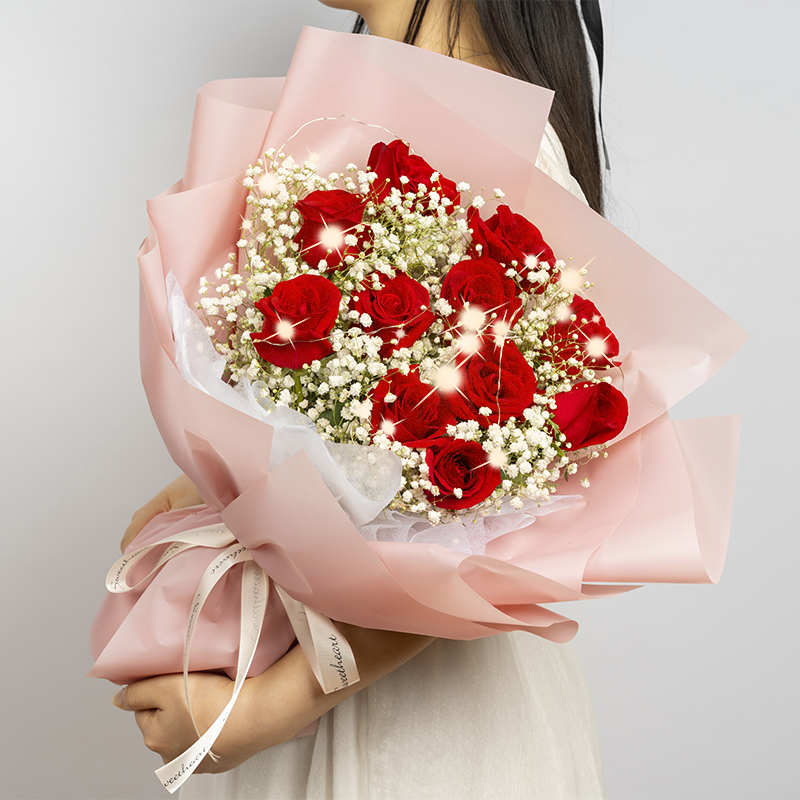 永久誓言-11枝卡罗拉红玫瑰搭配白色满天星,随机赠送1条串灯