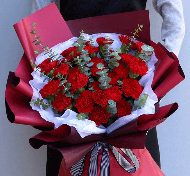 愿用余生爱你-33朵红色康乃馨花束搭配尤加利叶