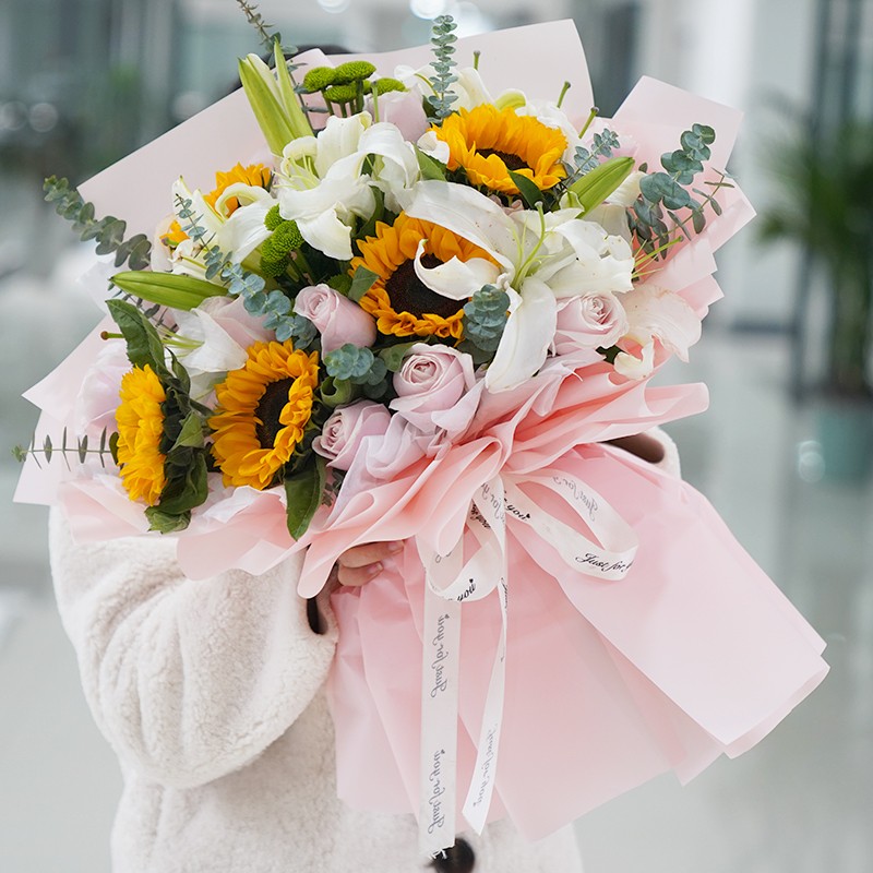 无穷思念-5枝向日葵,3枝多头白百合,9枝粉雪山玫瑰,尤加利叶、绿色小雏菊间插点缀
