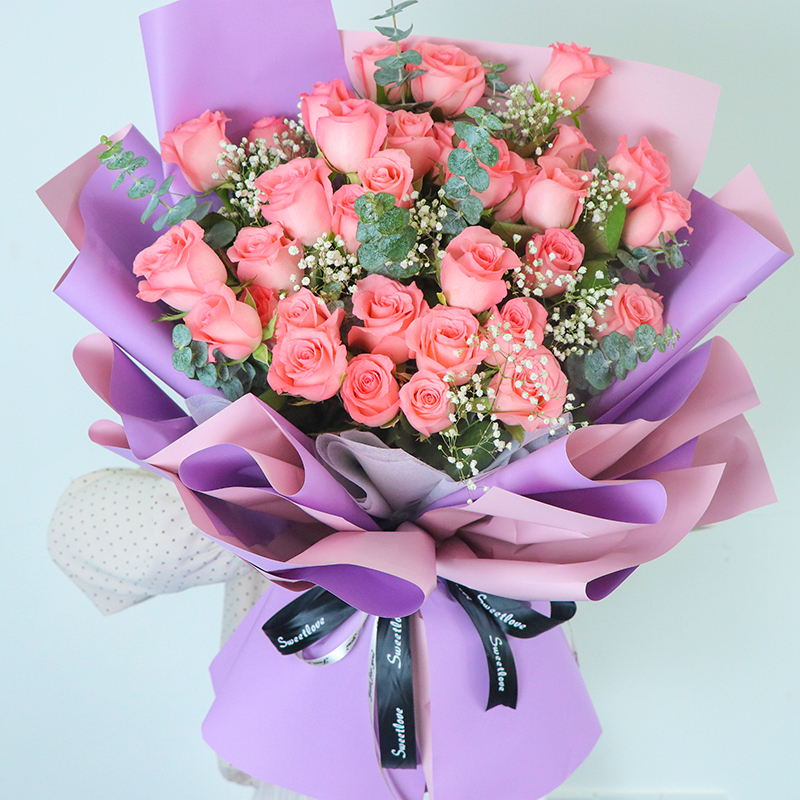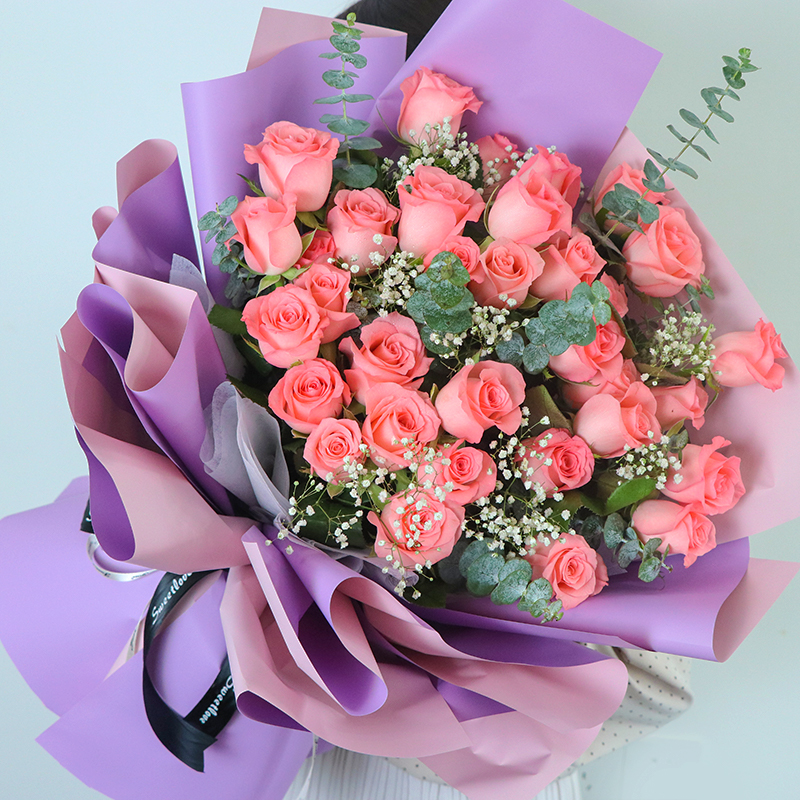 偏偏喜欢你-33朵精品粉色戴安娜玫瑰,搭配适量满天星、尤加利叶装饰