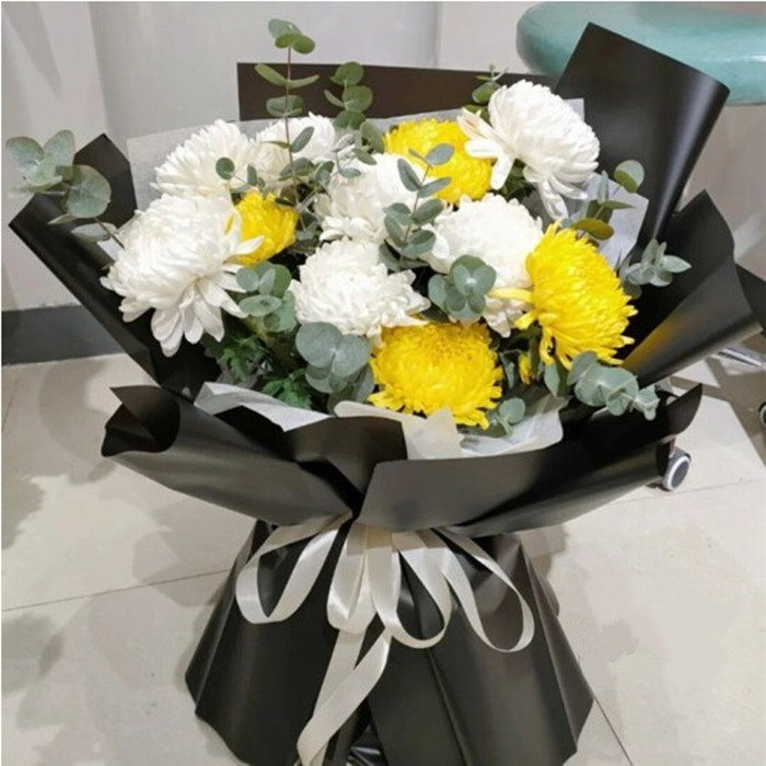 追思-7枝白菊4支黄色菊花(一共11支),尤加利叶丰满