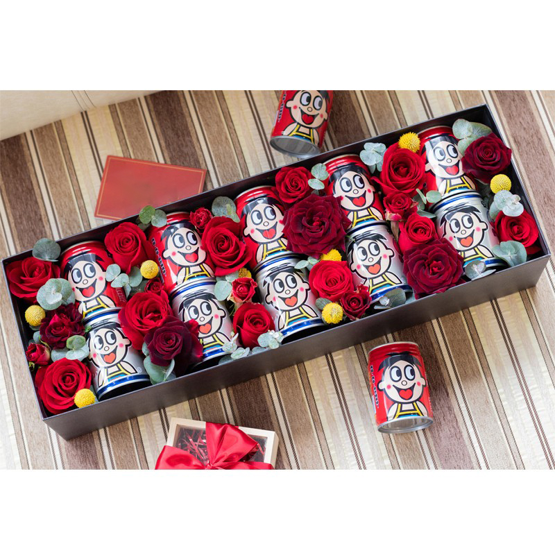 旺仔牛奶礼盒-旺仔牛奶罐装245ml,10罐。19朵精品红玫瑰丰满礼盒,搭配适量尤加利叶、黄金球
