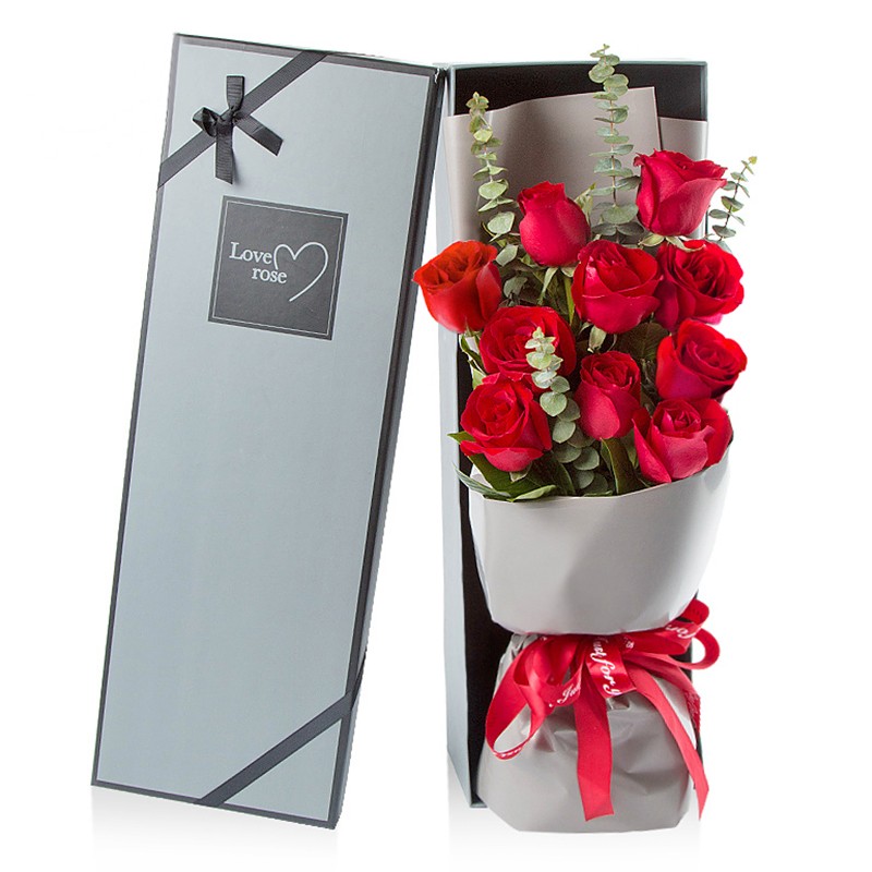 今生守候—— 11朵红玫瑰,尤加利丰满,灰色内包。长型礼盒外包