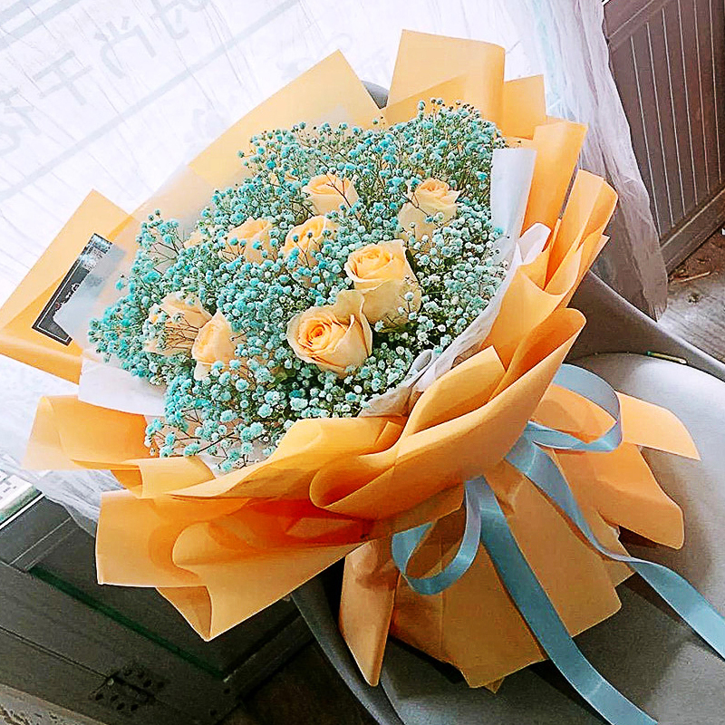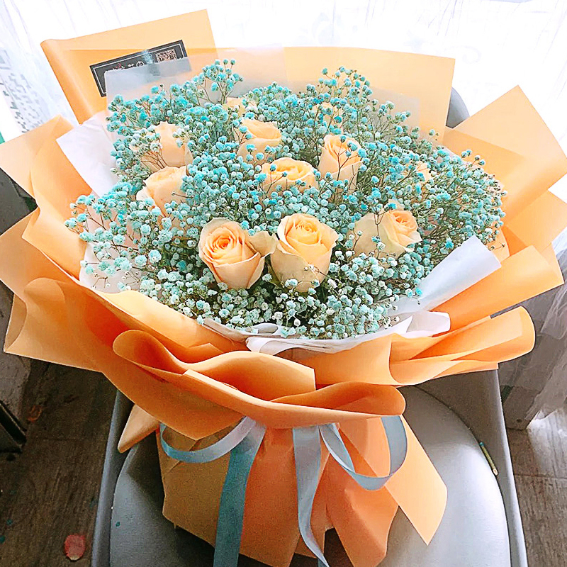 未忘初心- 11支香槟玫瑰,蓝色满天星丰满