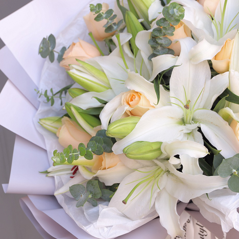 蓦然相愛-11只精品香槟玫瑰+5枝多头百合,搭配尤加利叶