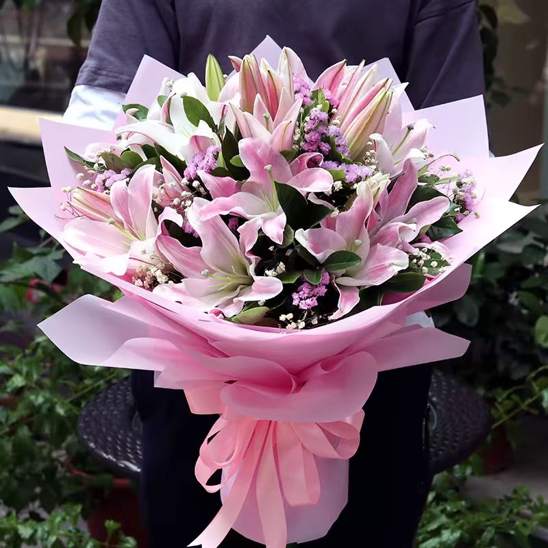 百事合意/粉色香水百合9枝、足量粉色勿忘我或者小雏菊,白色满天星