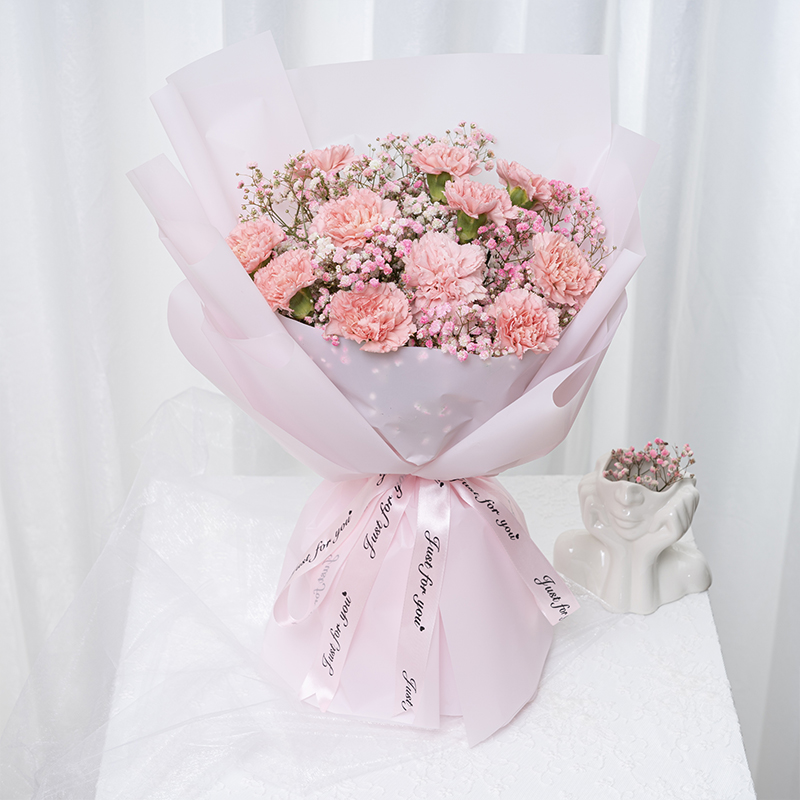 花开无声-11朵精品粉色康乃馨,粉色满天星