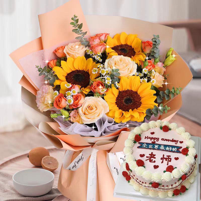 不期而遇 - 向日葵香槟玫瑰混搭花束+8寸复古鲜奶蛋糕